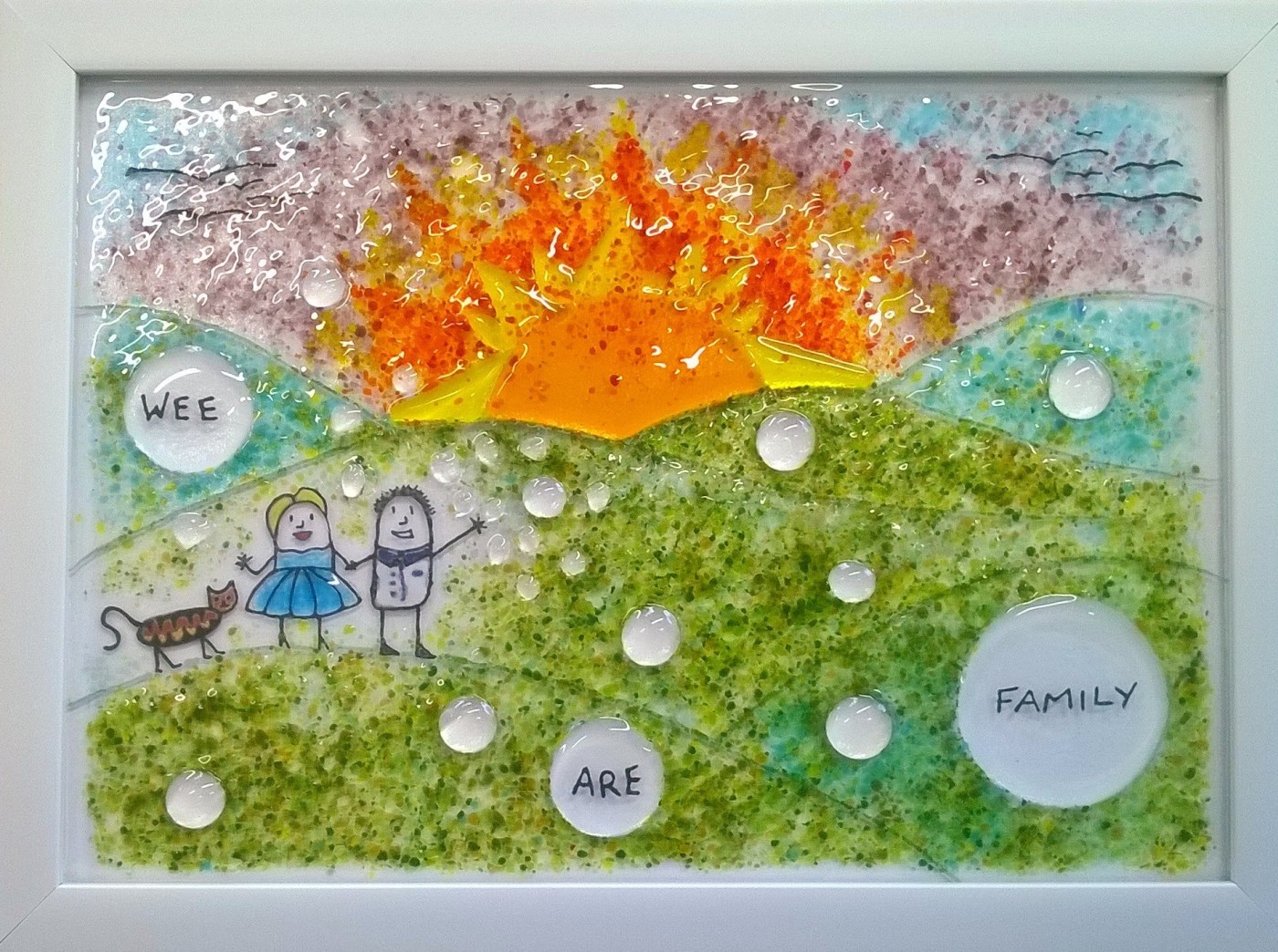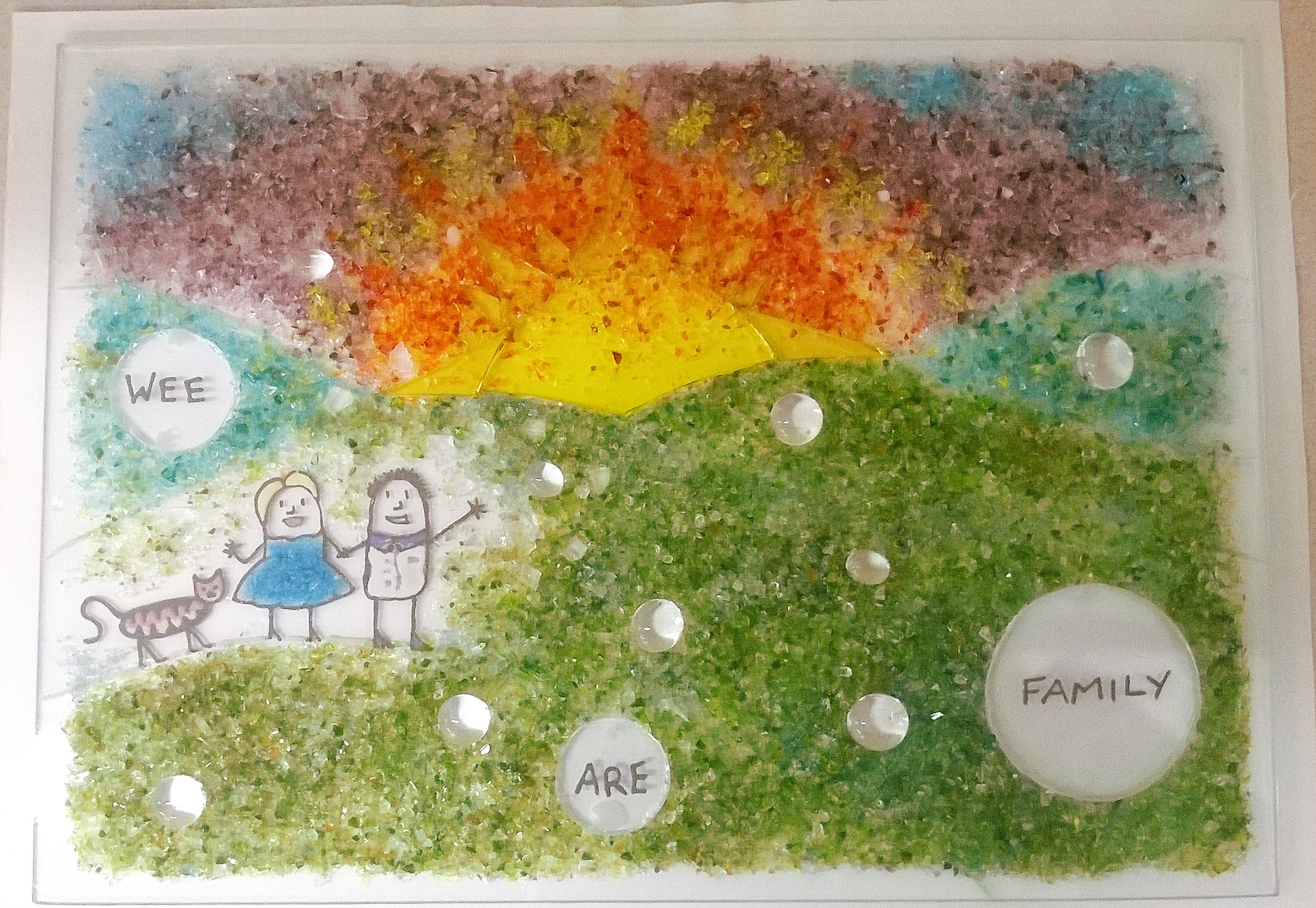 The artwork (Wee Are Family) was designed by one of their members and I used a combination of sheet glass, frits and line enamels. It just shows that even an illustrative artwork can be used as inspiration.