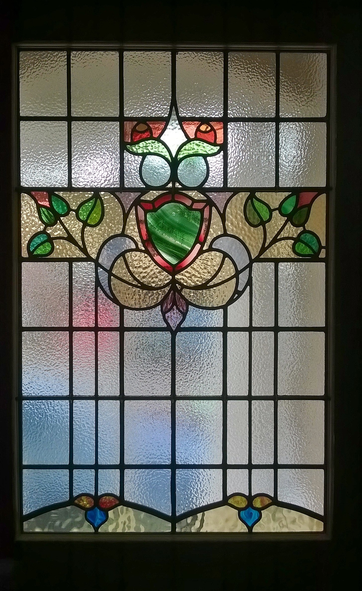 A 1930’s stained glass panel the studio recently restored for a clients front door entrance. Some wonderful use of colours in the original (hand-blown glass shield in the centre) and we were able to match some of the broken panes with heritage & new glass we had in stock. The glass was cleaned and a complete re-leading was needed. The restored panel, with new wooden beading and support bars is now back installed in the customers front door.